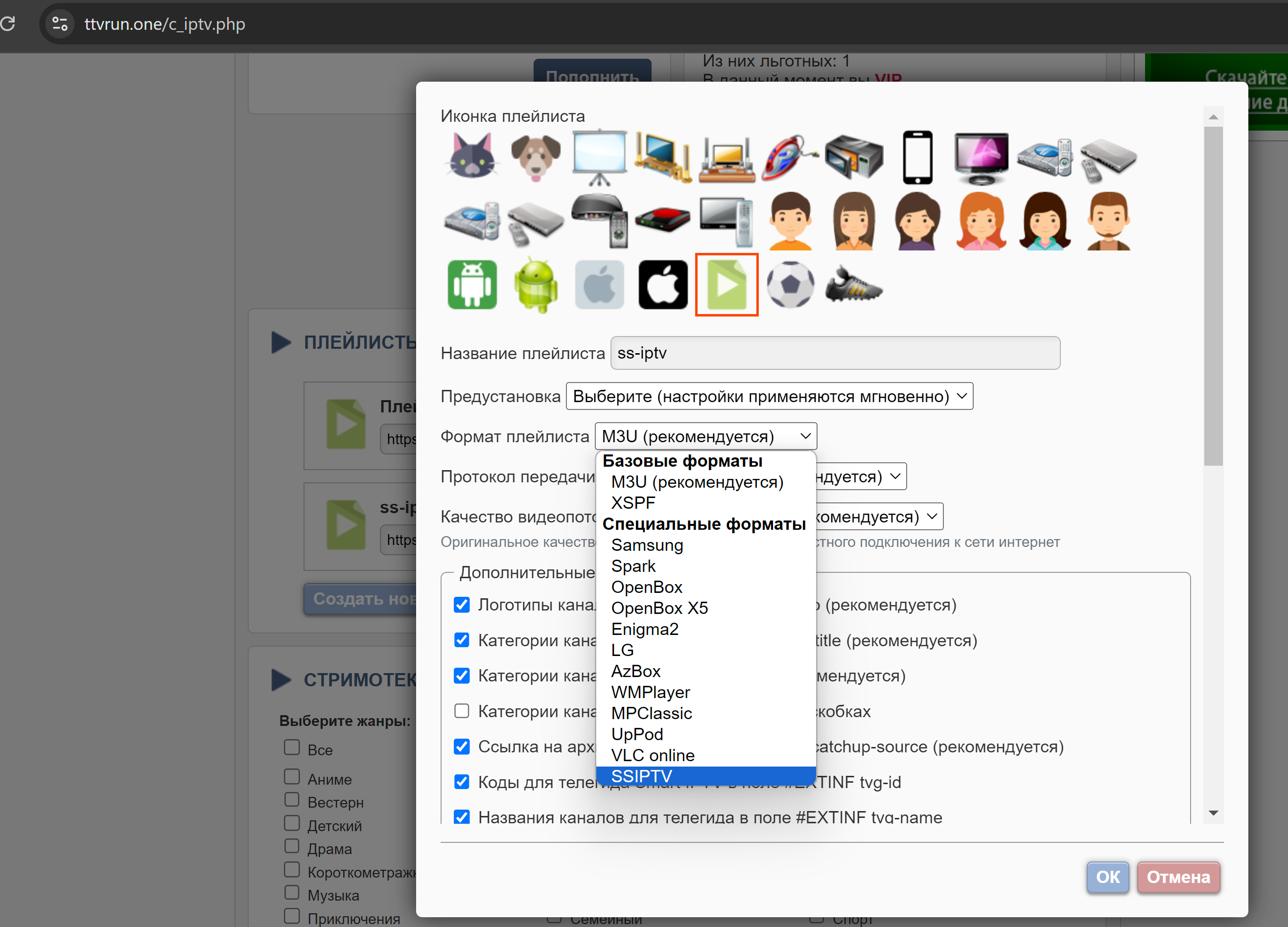 Нажмите кнопку "Создать новый плейлист" и в выпадающем списке "Формат плейлиста" выберите SSIPTV.