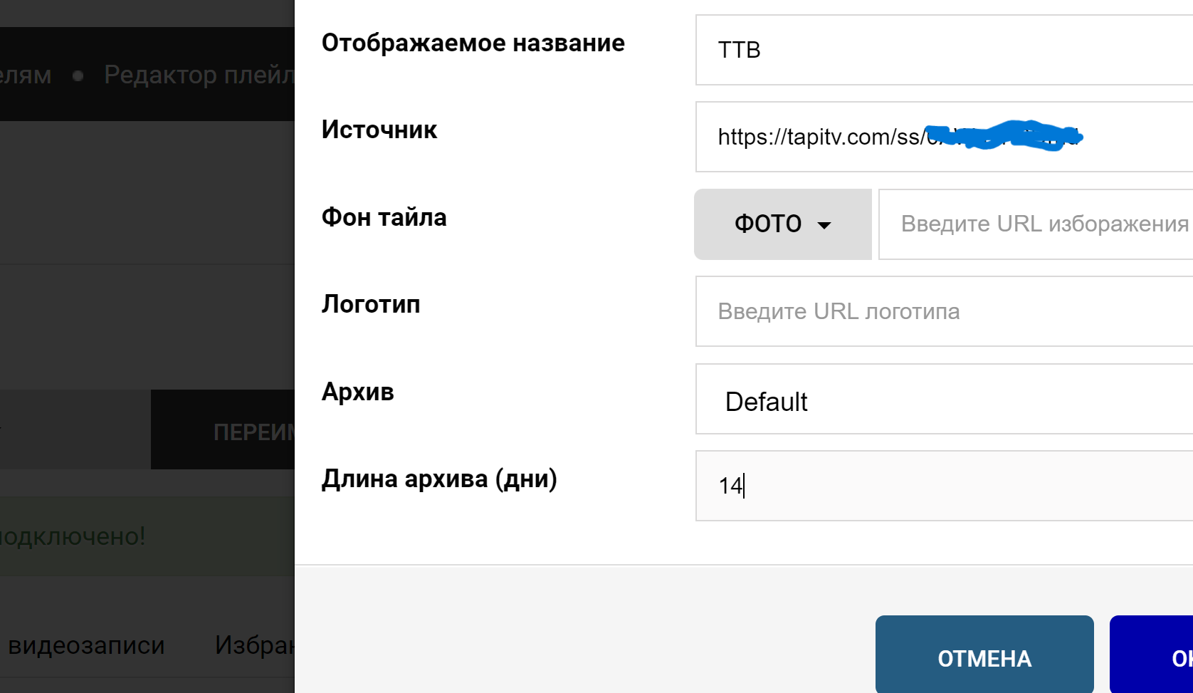 Откройте вкладку "Внешние плейлисты" и нажмите добавить элемент. Вставьте ссылку на плейлист из буфера в поле "Источник", значение Архив выберите "Default", а длину архива 14 дней.